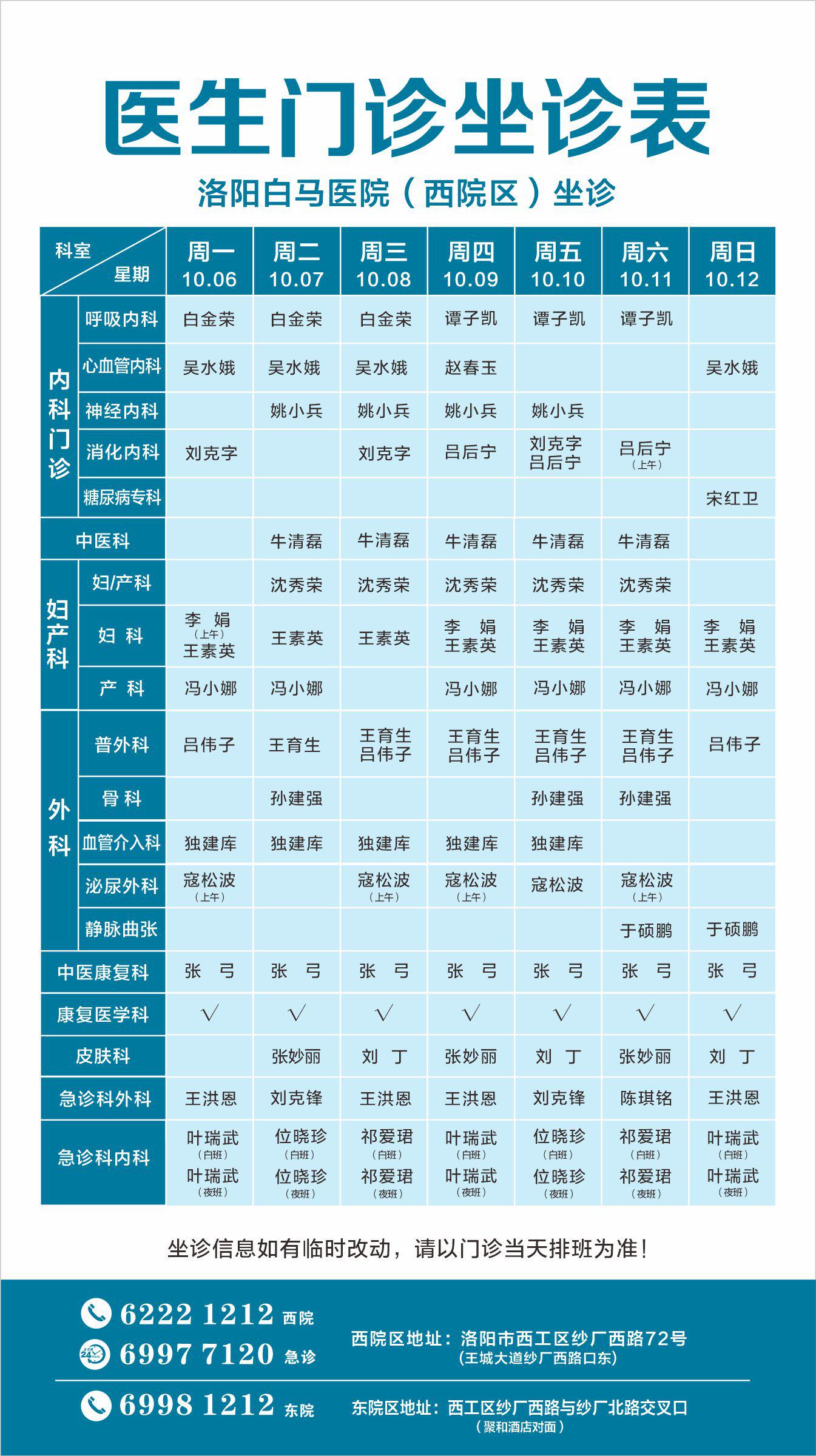 【10.06-10.12】洛阳白马医院医生门诊排班表