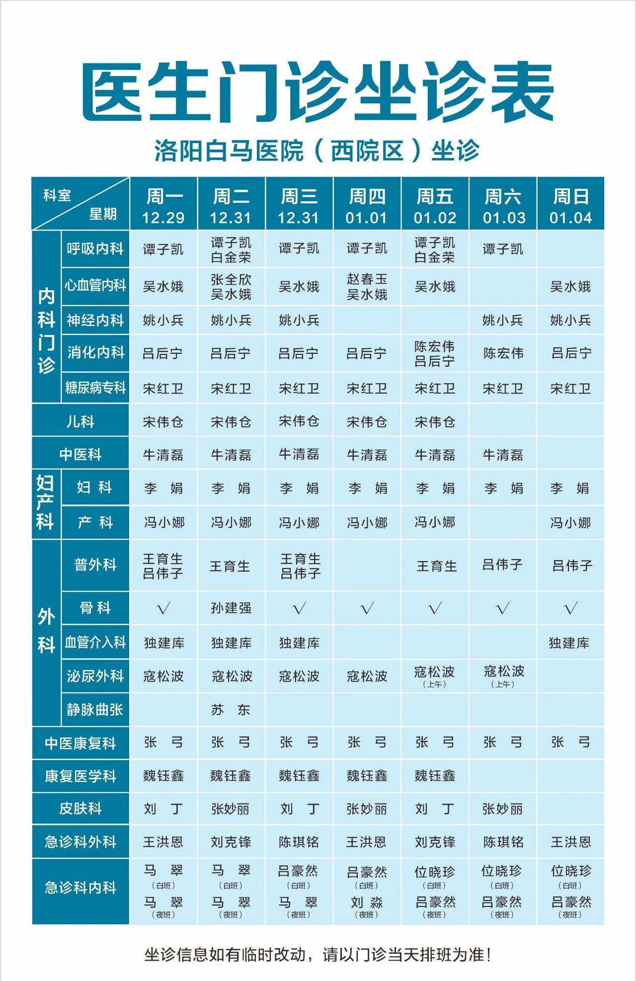 【12.29-01.04】洛阳白马医院门诊医生排班表