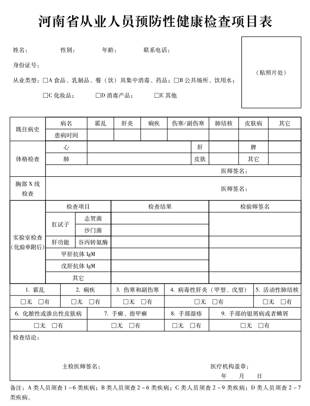 从业类型D类:(四)严格落实《消毒产品生产企业卫生规范》(卫法监发〔2000】217号)等有关要求,在对直接从事消毒产品生产的操作人员进行预防性健康检查时,必筛疾病包括:活动性肺结核病毒性肝炎、肠道传染病患者及病原携带者、化脓性或慢性渗出性皮肤病、手部真菌感染性疾病