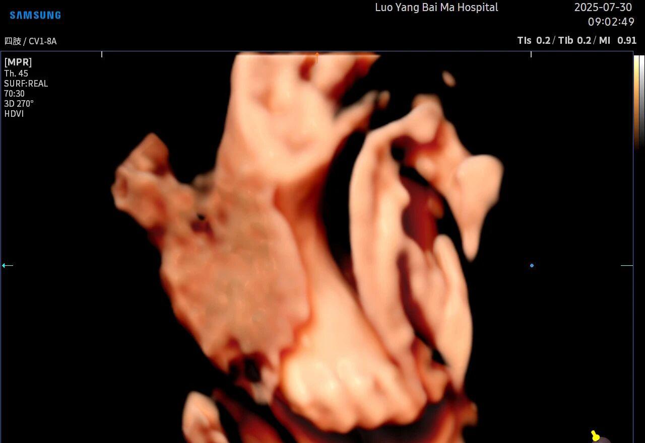 传统超声检查有时会因为胎儿体位、羊水量等因素的限制,导致某些部位观察不清。5D智能彩超技术能够实现对目标结构进行360°全方位、多切面的自由旋转观察。医生可以像“雕塑家”一样,从任意角度审视胎儿的解剖结构,尤其对于形态复杂的心脏、颅脑和脊柱等部位,这种能力可以极大弥补单一平面的局限性,帮助医生更全面地评估其发育状况。